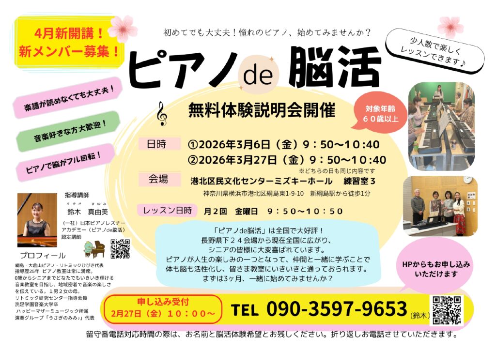 募集の詳細、レッスンの様子などはこちらから↓ピアノde脳活 4月初心者クラス開講します!